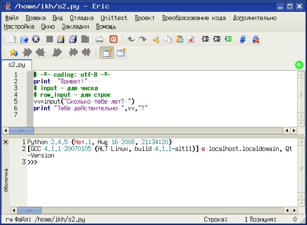 Shuningdek, IDE Eric maxsus Python uchun ishlab chiqilgan (1.3-rasm), u dasturlar va yirik dasturiy ta'minot loyihalari uchun juda ko'p sozlash va disk raskadrovka qilish qobiliyatiga ega. Biroq, ushbu rivojlanish muhiti (aniqrog'i uning tashqi ko'rinishi) sezilarli darajada soddalashtirilishi va yangi boshlanuvchilar uchun tushunarli bo'lishi mumkin (1.4-rasm).