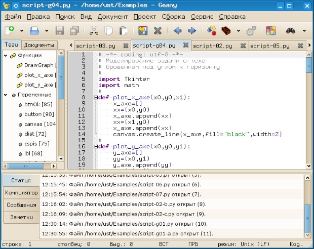 Python- dan tashqari siz boshqa ko'plab dasturlash tillari bilan ishlashingiz mumkin bo'lgan cross-platformali IDE Geany (1.5-rasm) ham qiziqish uyg'otadi.