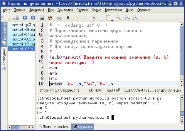 Bundan tashqari, Python dasturlarini (va boshqa ko'plab dasturlash tillarini) yaratish va bajarish uchun siz dasturchilar uchun KDE integratsiyalangan muhitining bir qismi bo'lgan Kate matn muharrirlaridan foydalanishingiz mumkin (1.6-rasm). Dasturni ishga tushirish uchun Kate terminal oynasida python file_name.py buyrug'idan foydalaning.
