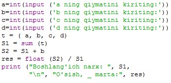 a ning qiymatini kiriting:5 b ning qiymatini kiriting:6 c ning qiymatini kiriting:8 d ning qiymatini kiriting:9 boshlang'ich narx: 28 O'sish, _ marta: 1.2142857142857142 |