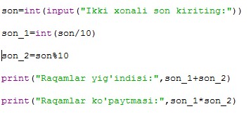 Masalaninq qo’yilishi. Ixtiyoriy ikki xonali son berilgan uning raqamlar alohida ajratib olib, raqamlarni yig’indisi va ko’paytmasini hisoblaymiz.
