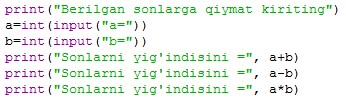 6 topshiriq. Ikkita haqiqiy a va b son berilgan bo’sin. Sonlarni ayirmasi, yig’indisi va ko’paytmasini topish dasturini tuzing.