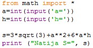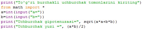 Masala 3. Uchburchakning uch tomonining uzunligi ma'lum. Geron formulasidan foydalanib, uchburchak va maydonning perimeyrini hisoblang (izoh: math modul va sqrt ( ) funksiyasidan foydalaning ).
