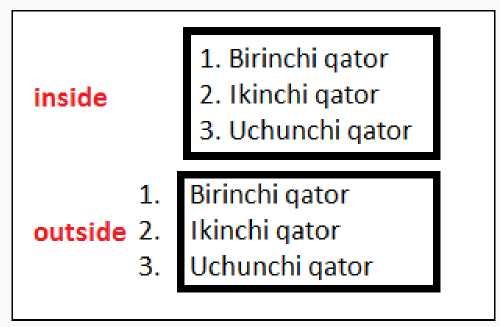 - inside - markerni ro‘yxat bloki ichiga joylashtirish.